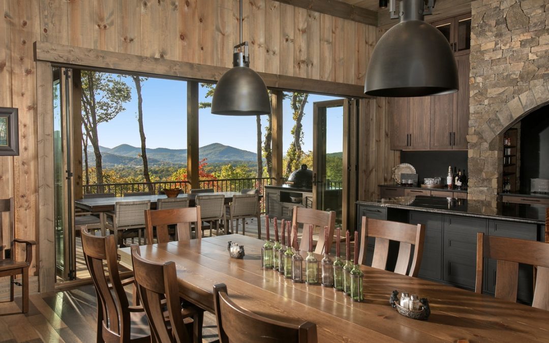 Kitchen View of Custom Home in Blairsville Georgia. The 12-foot kitchen island, large dining tables inside and out, and folding glass doors onto the porch work together to make entertaining casual and intentional.