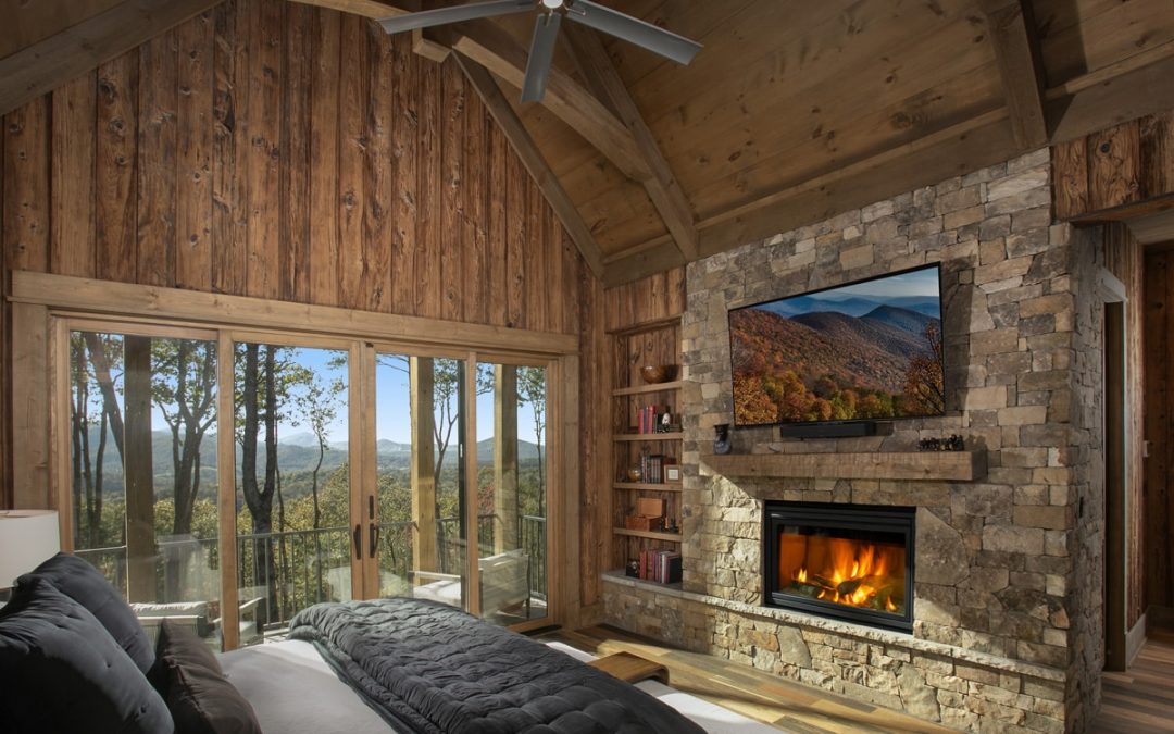Master Bedroom of a Custom Home in Jasper Georgia. This primary suite has an undisturbed view of the surrounding mountains, a custom stone wall with a gas fireplace, built-in bookcase and flat screen television.